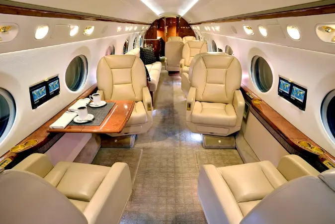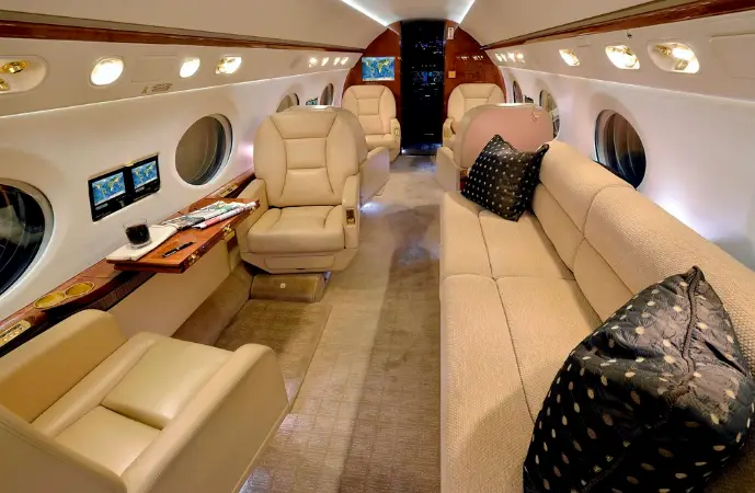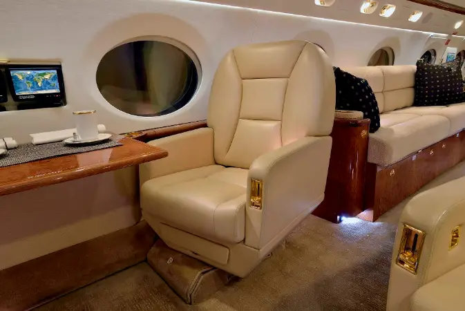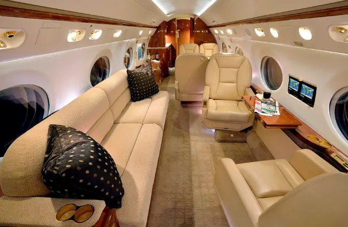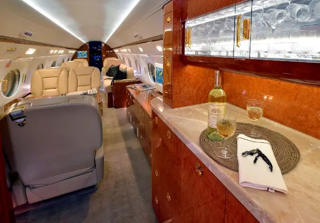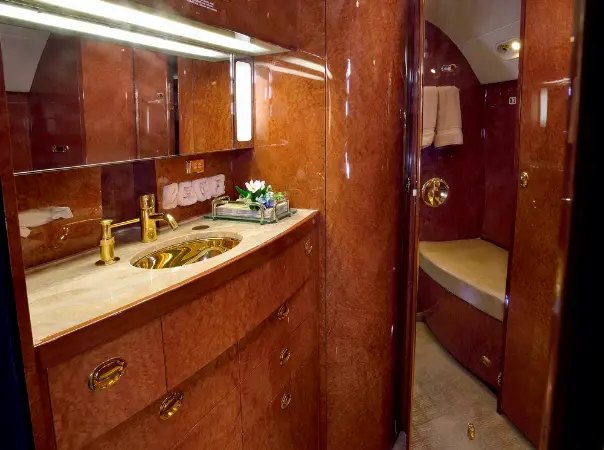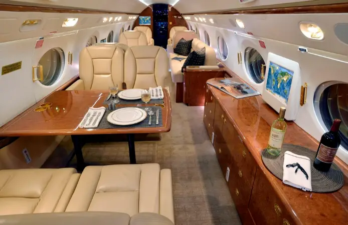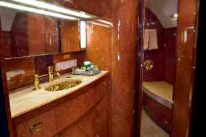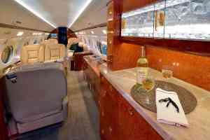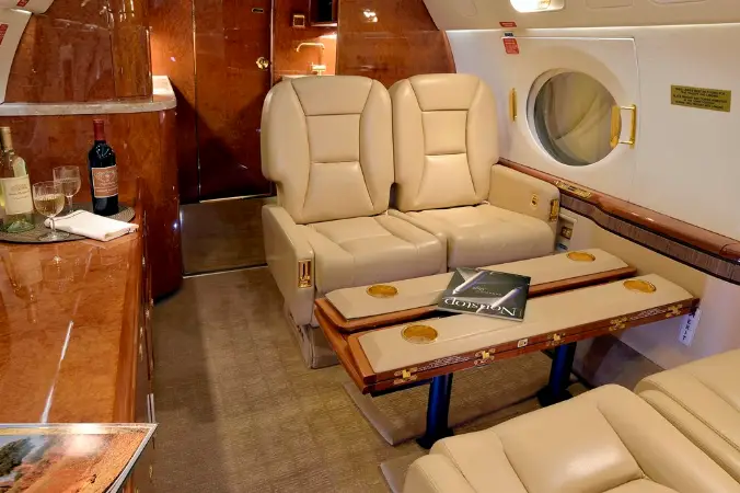 This Gulfstream G450 features a fourteen passenger interior. The forward cabin is configured with a four place forward club that transitions into a dual mid-cabin single club configuration. The mid-cabin club is opposite a four place divan with end cabinets for passenger storage and convenience. The aft cabin is configured for a four place conference group opposite a right hand side credenza. The headliner, PCU panels and upper side walls are covered in light sand colored Ultra-Leather that transition to a light sand lower side wall. The carpet (Installed new in 2015) has a square tapestry pattern design and is a handmade in light brown and cream color. The side walls compliment the seats covered in Edelman leather. The cabinetry is finished in quarter figure Nyatoh high gloss veneer with polished gold fixtures throughout the cabin. The galley is equipped with a high temperature oven, microwave, dual coffee makers, and a granite counter top. The aircraft has two fully enclosed lavatories for privacy. The forward crew lavatory and an aft passenger lavatory are finished with Nyatoh high gloss veneer, Limestone Countertops and polished gold fixtures throughout.