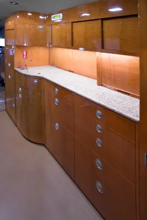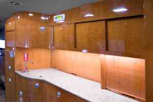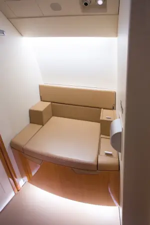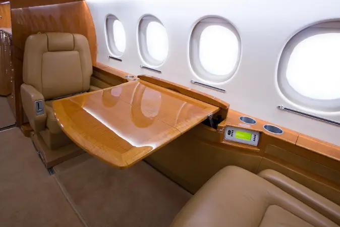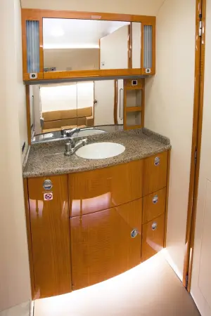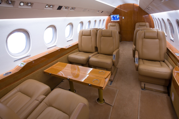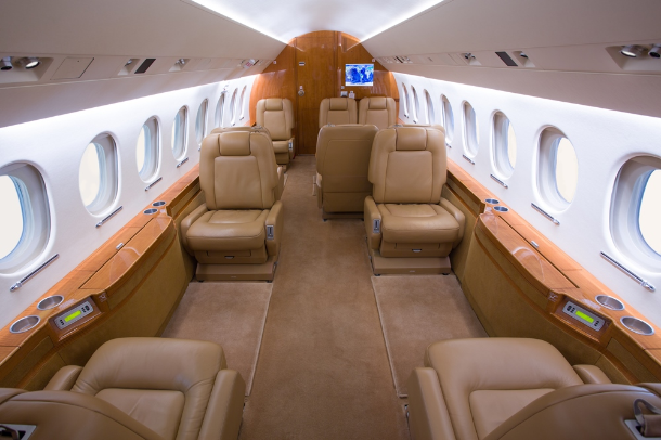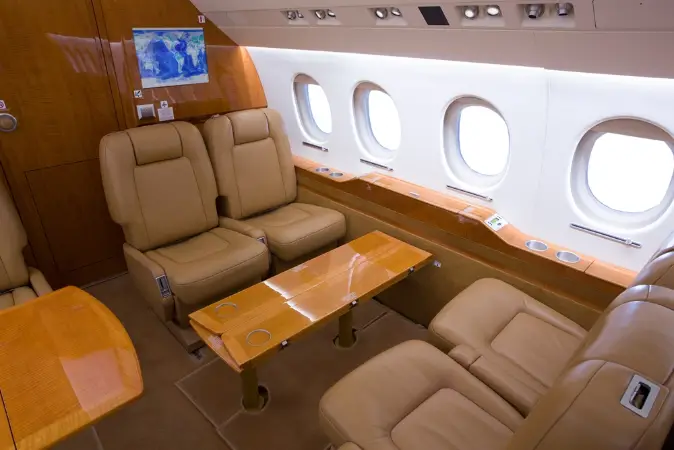 This Falcon 2000EX EASy features a 10 passenger interior to include a right hand forward S galley and a 15 inch galley annex with a coffee maker, espresso maker, and high temperature over for full food and beverage service. The aft cabin is configured in a four place conference group with a table for dining, beside two slim line single seats and one stow able executive card table. The galley and cabinetry are finished in high gloss quarter figured anigre veneer with golden leaf granite counter tops installed in the galley and lavatory. The seats are finished in warm earth tone leather with coordinating almond ultra-leather headliner and window panels. The cabin fixtures are finished in brushed aluminum for a bold accent. A neutral beige custom wool carpet is continuous from the entry to the aft lavatory and transitions nicely to the embossed beige lower sidewalls.