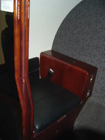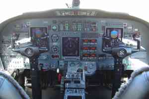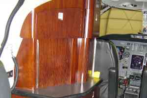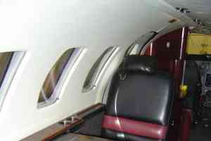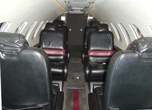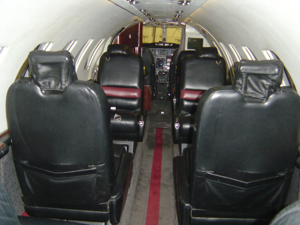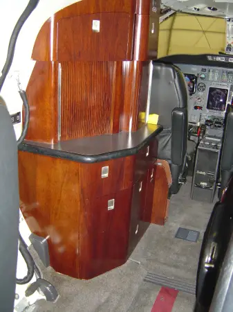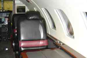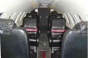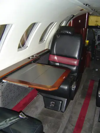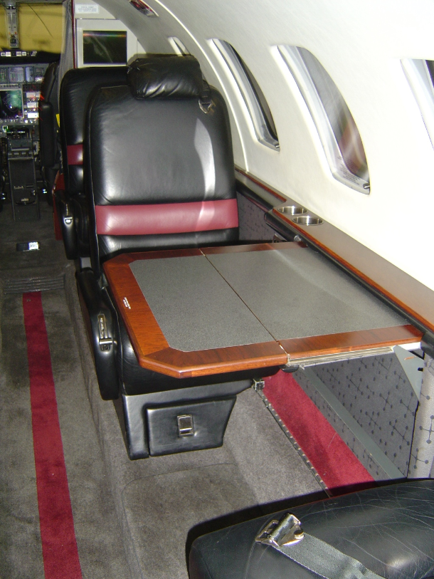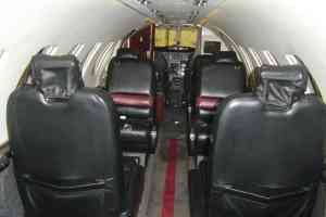 Seven passenger center club configuration plus belted lav seat. Forward LH refreshment center. Two executive fold-down tables. Aft fully enclosed flushing lav. Under-seat storage drawers. Black leather seats with Red stripe accent, light contrasting headliner and window panels, cut pile Charcoal Gray carpet with Red accent, and wood veneer cabinets. New May 2004 by Duncan Aviation