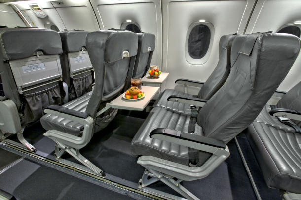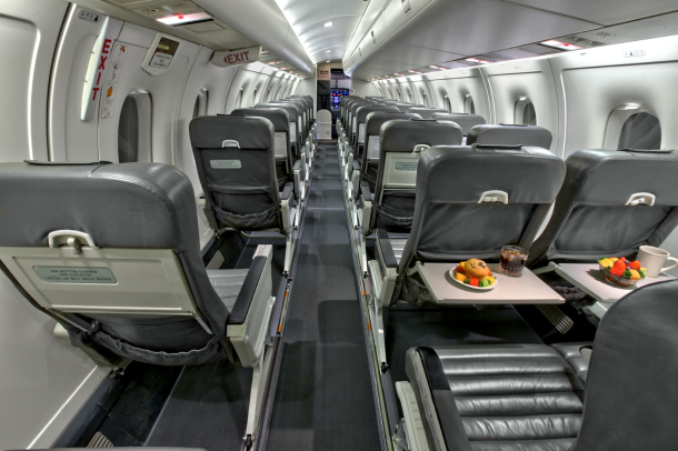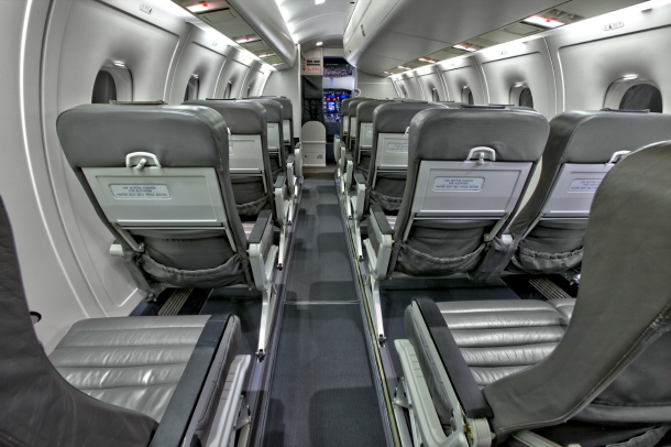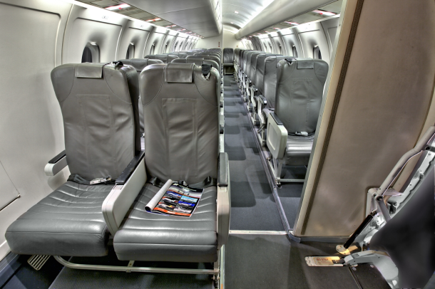 Commuter configured interior for 32 passengers, with leather seating, aft galley and overhead storage bins.