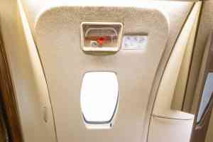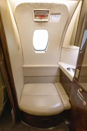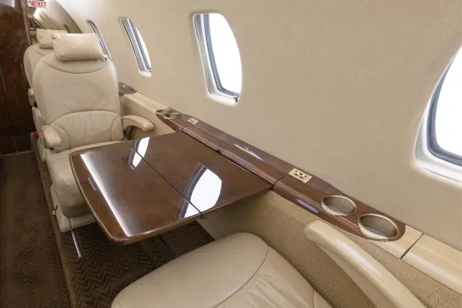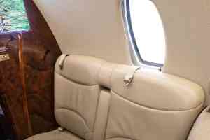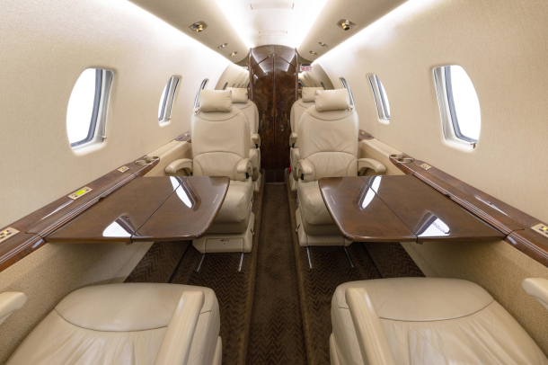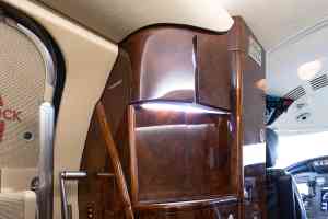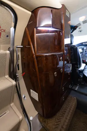 Six premium tan leather executive seats are complimented by a two-place side facing divan opposite entry door and belted seat opposite the lav. Burl cabinetry, tan headliner, tan sidewalls, neutral lower sidewalls and brown carpeting, extended galley with ample storage and ice cooler.