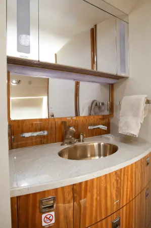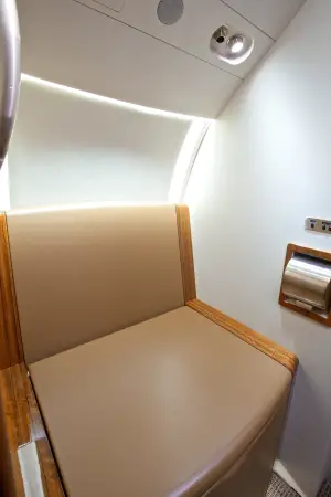 10 passenger configuration with double club, four place conference group and an aft club with an offset aisle lavatory door