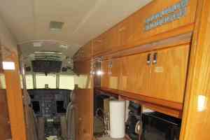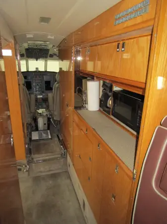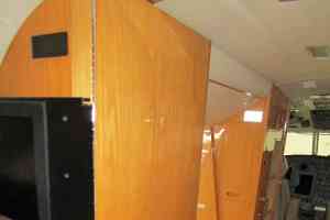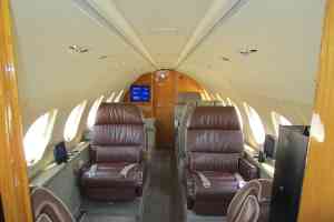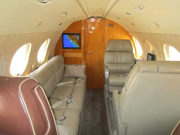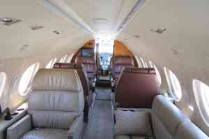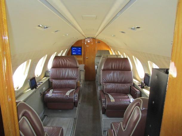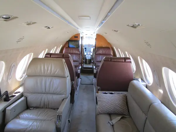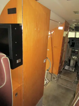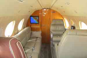 Nine passenger executive interior with forward four place club. Aft cabin features a three-place divan opposite two single seats. Forward chairs are Townsend Leather Custom Brown Stone. Aft divan and chairs are Townsend Leather Classic Cow. A White Oak high gloss veneer is on the cabinetry. Right hand forward galley features coffee maker, microwave oven, and wine storage and Corion countertops. Cabin entertainment includes Airshow Genesys with DVD, forward and aft Rosen monitors and six Rosen personal monitors. Headliner is a light cream color. Lower sidewalls and drink rails are light leather. Taupe custom carpet. New interior by Duncan Aviation September, 2000. Interior is in very good condition.