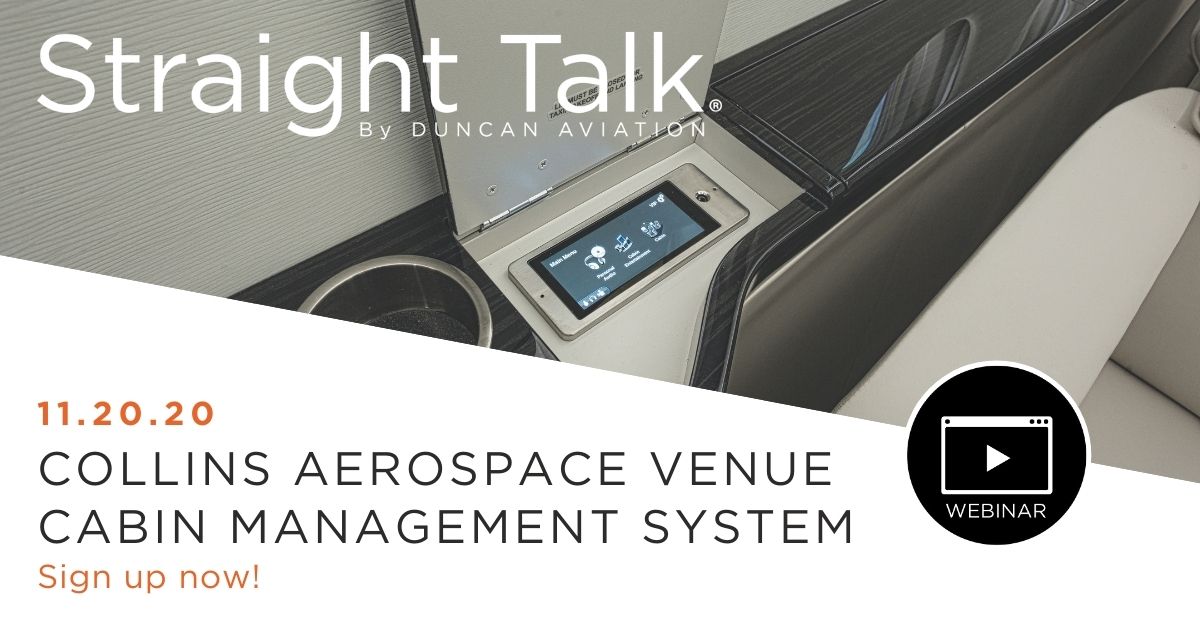 LINCOLN, NEB — Duncan Aviation is excited to announce its November webinar topic: Collins Aerospace Venue Cabin Management System. On Friday, November 20, at 11 a.m. CST, Tom Simon with Collins Aerospace will give an overview of the Venue Cabin Management System with commentary from Duncan Aviation’s Steve Elofson and Jason Thuman on their experiences with Cabin Management System upgrades.