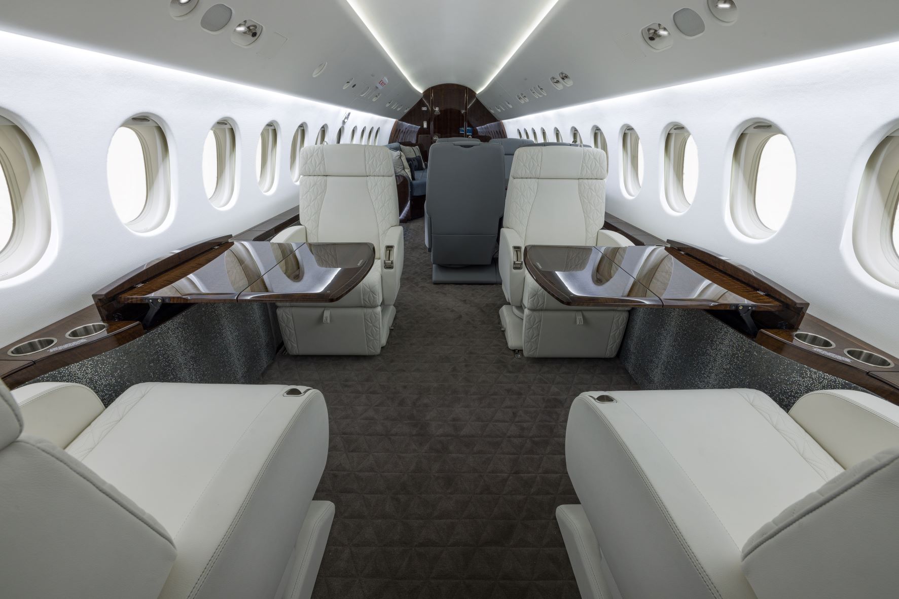 Each section of the cabin is visually separated into its own area by virtue of a subtle color change on the seating. Yet each area perfectly complements the other, flowing easily from one to the next, united by elements such as the foil-fused lower sidewall material, carved carpet, and stitching details.