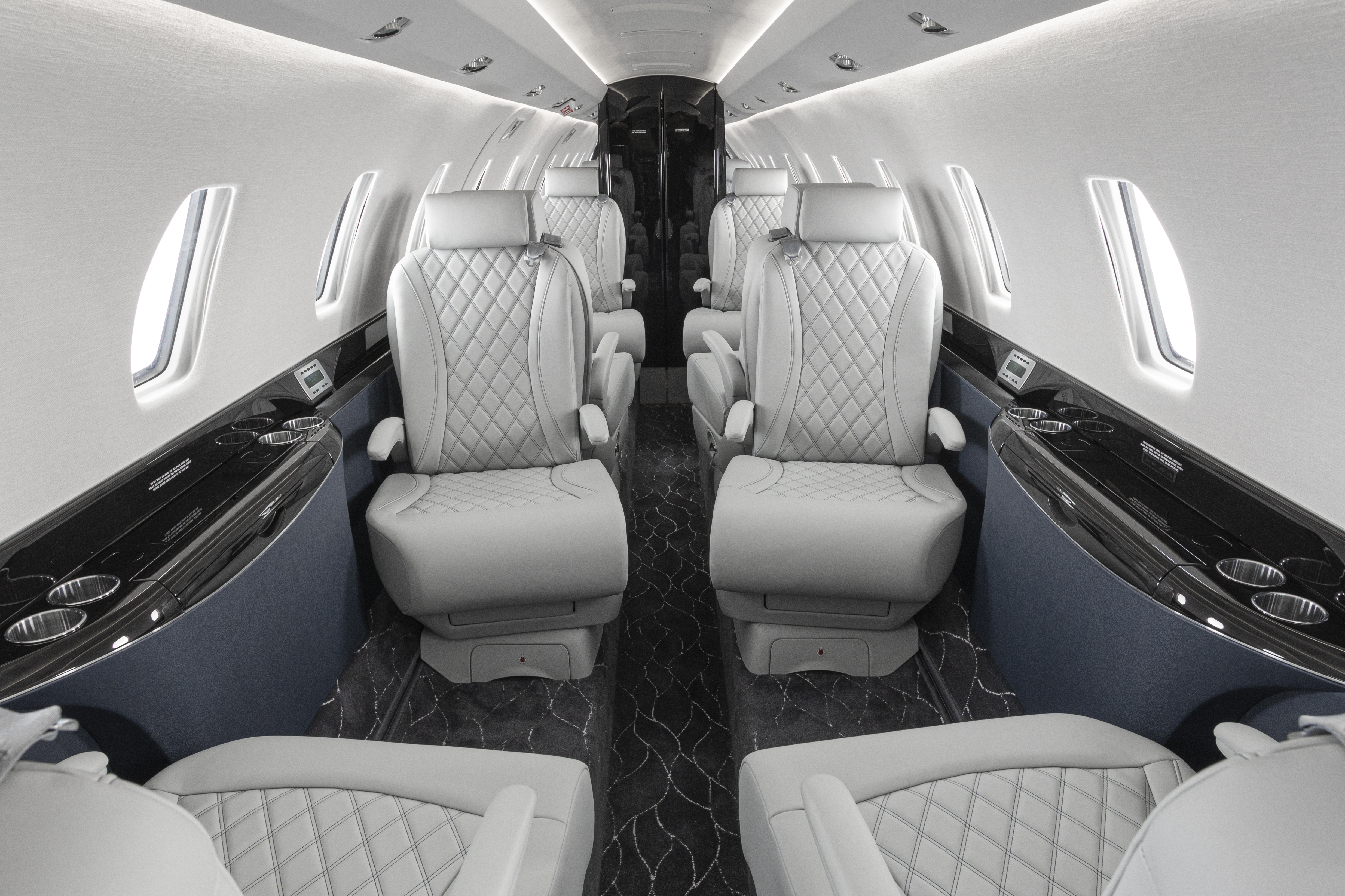 The owner of the aircraft envisioned a classic updated scheme that included subtle patterns in a cool grey, almost navy color scheme. Highlights of the interior included quilted double-stitched diamond pattern inserts in the seats and dark, rich navy sidewalls.