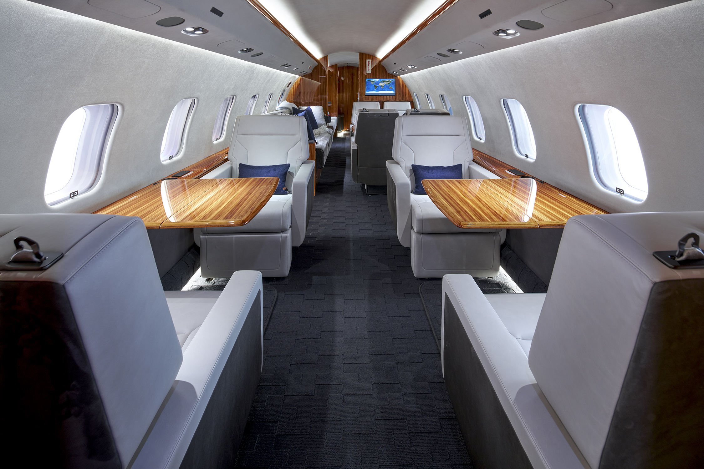 In the lavatory, the owner’s desire to incorporate carbon fiber culminated in a subtly iridescent blue finish that reveals itself in the light—tying in beautifully with the cabin’s blue-tinted carpet and accent pillows. The upper sidewalls feature real suede panels that was made possible due to their small size.