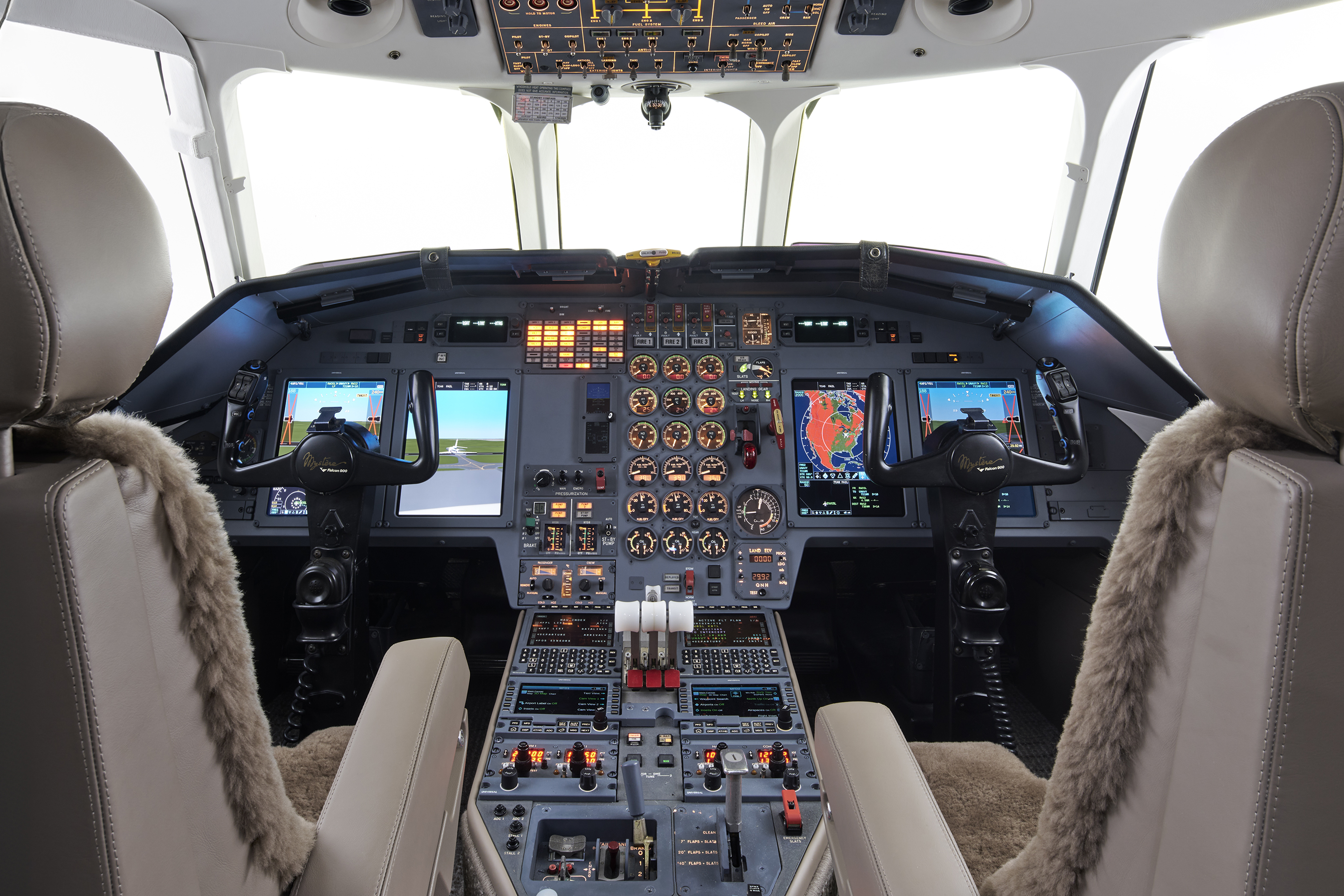 The operator of a Falcon 900B recently left Duncan Aviation’s MRO location in Battle Creek, Michigan, after extensive avionics upgrades, a 2C Inspection, and an interior refurbishment. The owner opted to upgrade to the Universal Avionics InSight Flight Display System, replacing the obsolete CRT equipment with bright, crisp displays that provide cutting-edge, 3D graphics for the SVS (Synthetic Vision System), weather, terrain, and traffic systems.