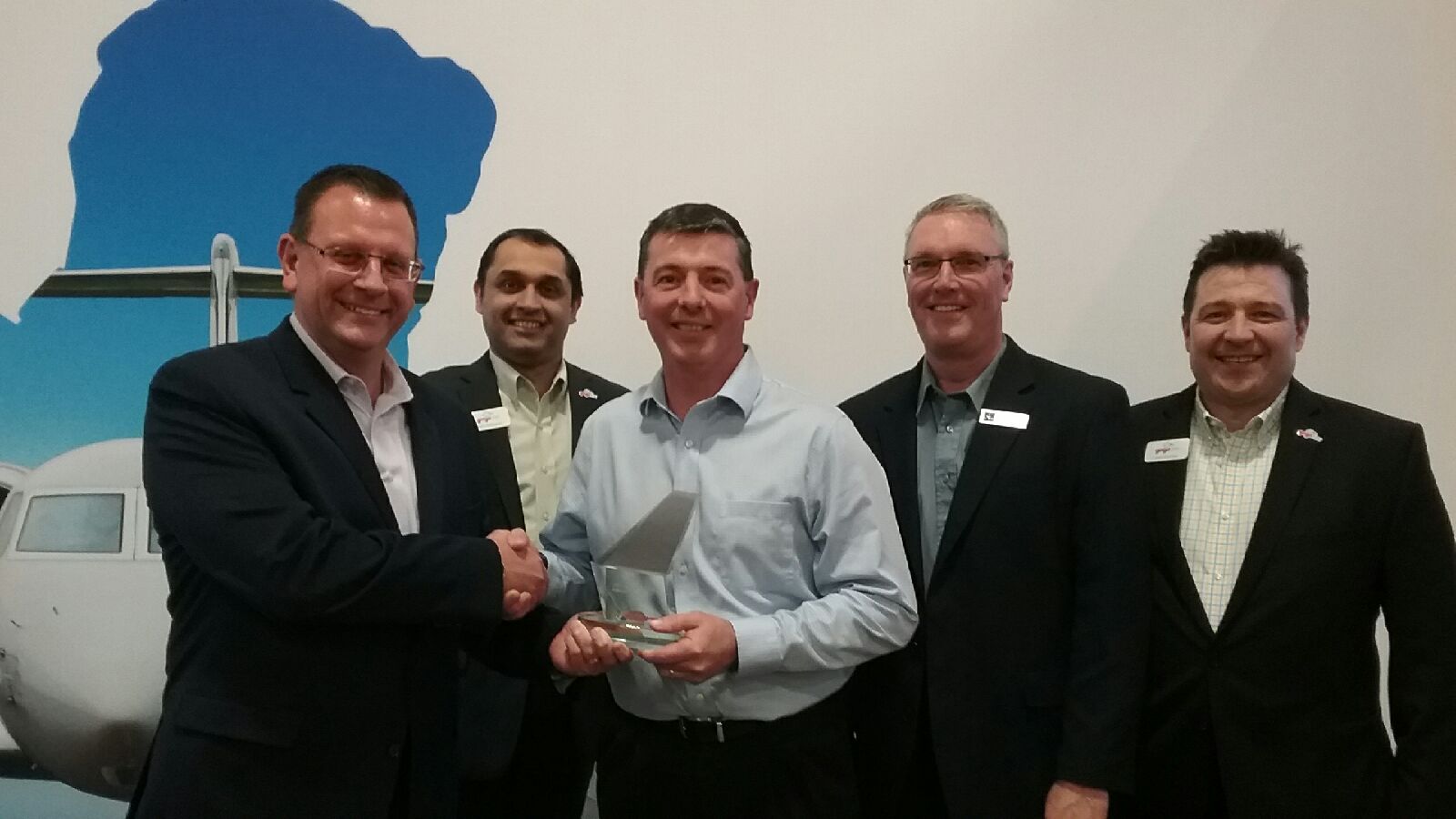 Dave Salvador, Vice President of Aftermarket Sales, and Regional Sales Managers Andy Fernandes and Chad Ostertag presented the award to Duncan Aviation Vice President of Components Services & Satellite Operations Mark Cote and Duncan Aviation Business Development Manager Kevin Miesbach. Cote and Miesbach accepted the award on behalf of Duncan Aviation but expressed there was a large group within the company who contributed a great deal of time and effort to achieve this status and all deserve to be recognized.