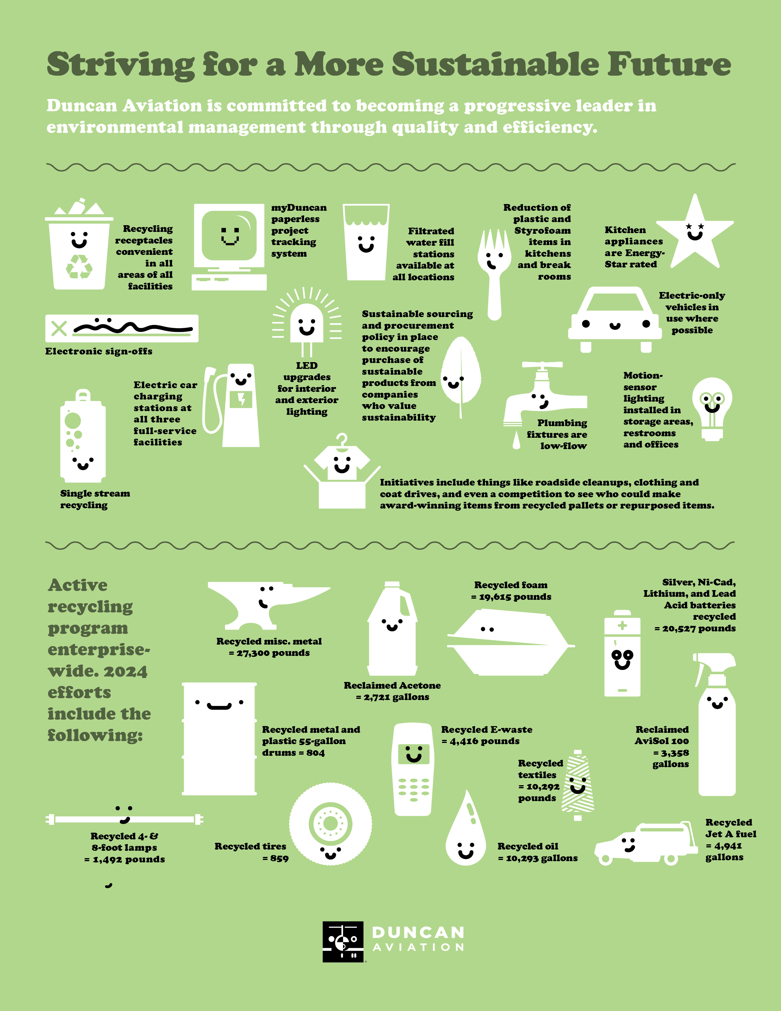 Duncan Aviation has Environmental Supervisors at its full-service facilities who create sustainability goals every year. These initiatives include using products that are environmentally friendly, supporting vendors who also value sustainability, and encouraging recycling and re-use wherever possible.