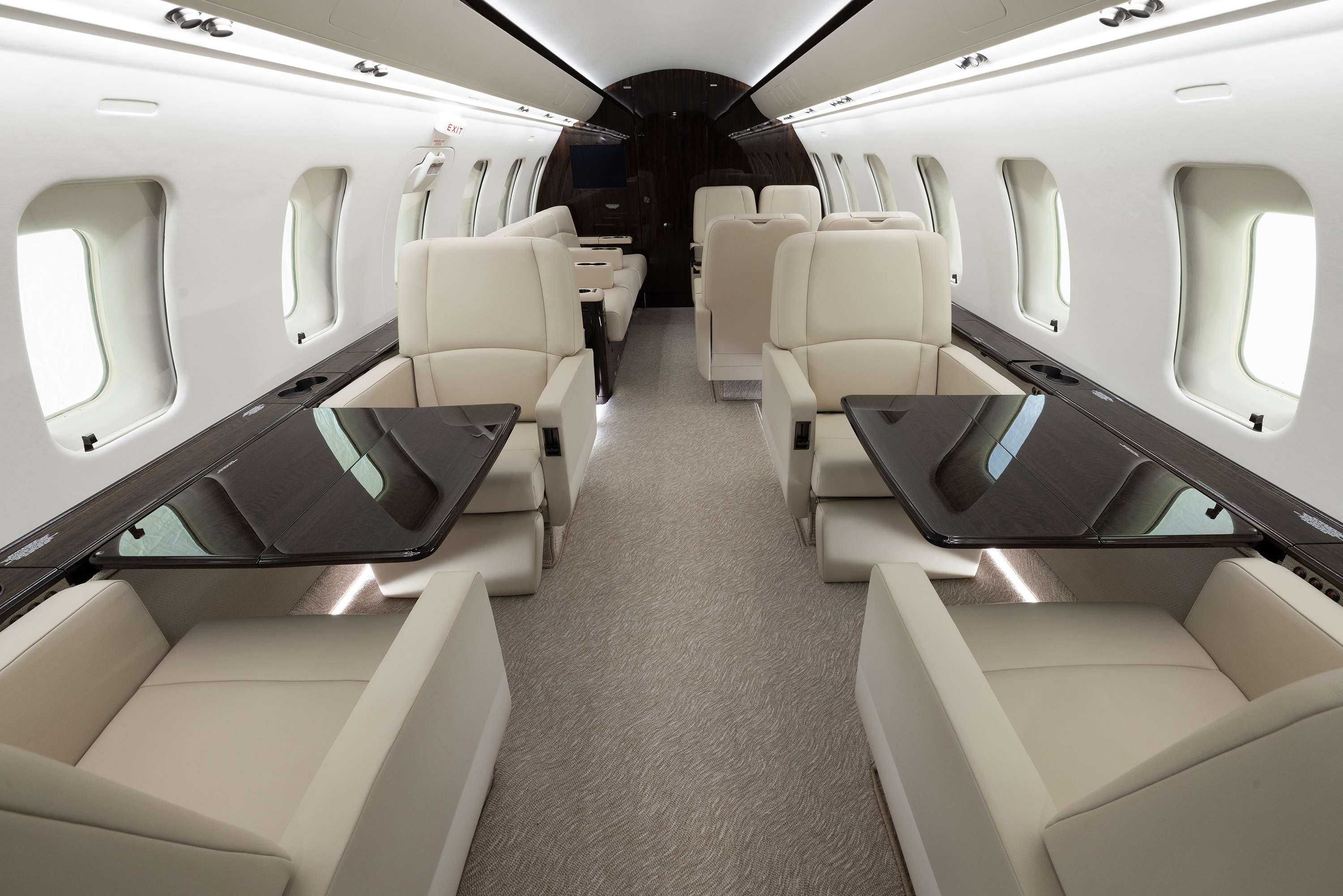 The new interior reimagines the aircraft’s original beige palette, opting for clean, modern tones that are as timeless as they are elegant. The owner’s choice of a wool and silk loop-patterned carpet pairs beautifully with light taupe textured lower sidewalls, ultraleather upper sidewalls, and a fresh headliner. The veneer, a quarter-figured paldao, is stained in a custom warm brown tone that features bold veining without the distracting yellow or orange tints that can be inherent in this species of veneer. It is prominently showcased in the galley and lavatory, along with tables, drink rails, and dividers, creating a cohesive look.