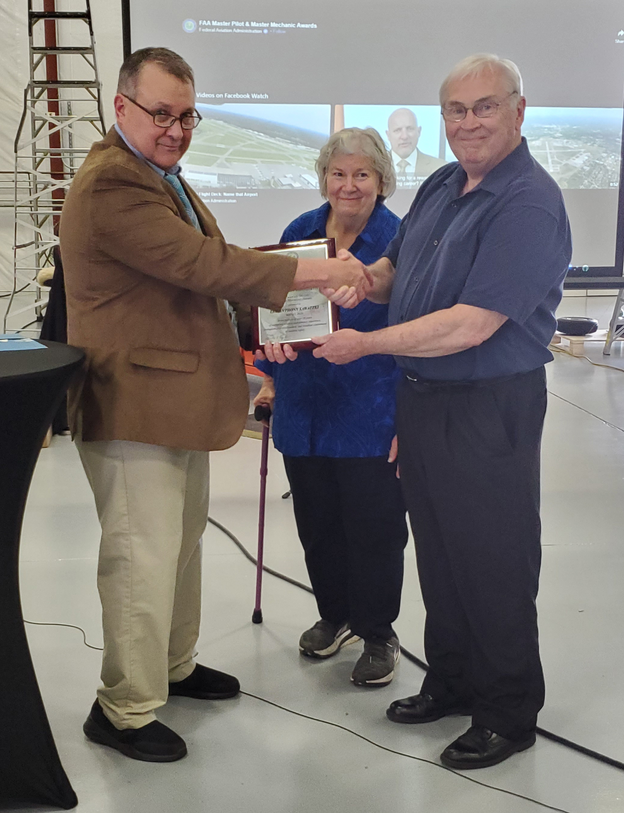 Sawatzki was awarded this recognition in 2020, but the pandemic delayed its presentation. During a reception held at Duncan Aviation, Leo and his wife Linda were honored and presented the award by Owen Grimm, DOT/FAA FAASTeam Program Manager.