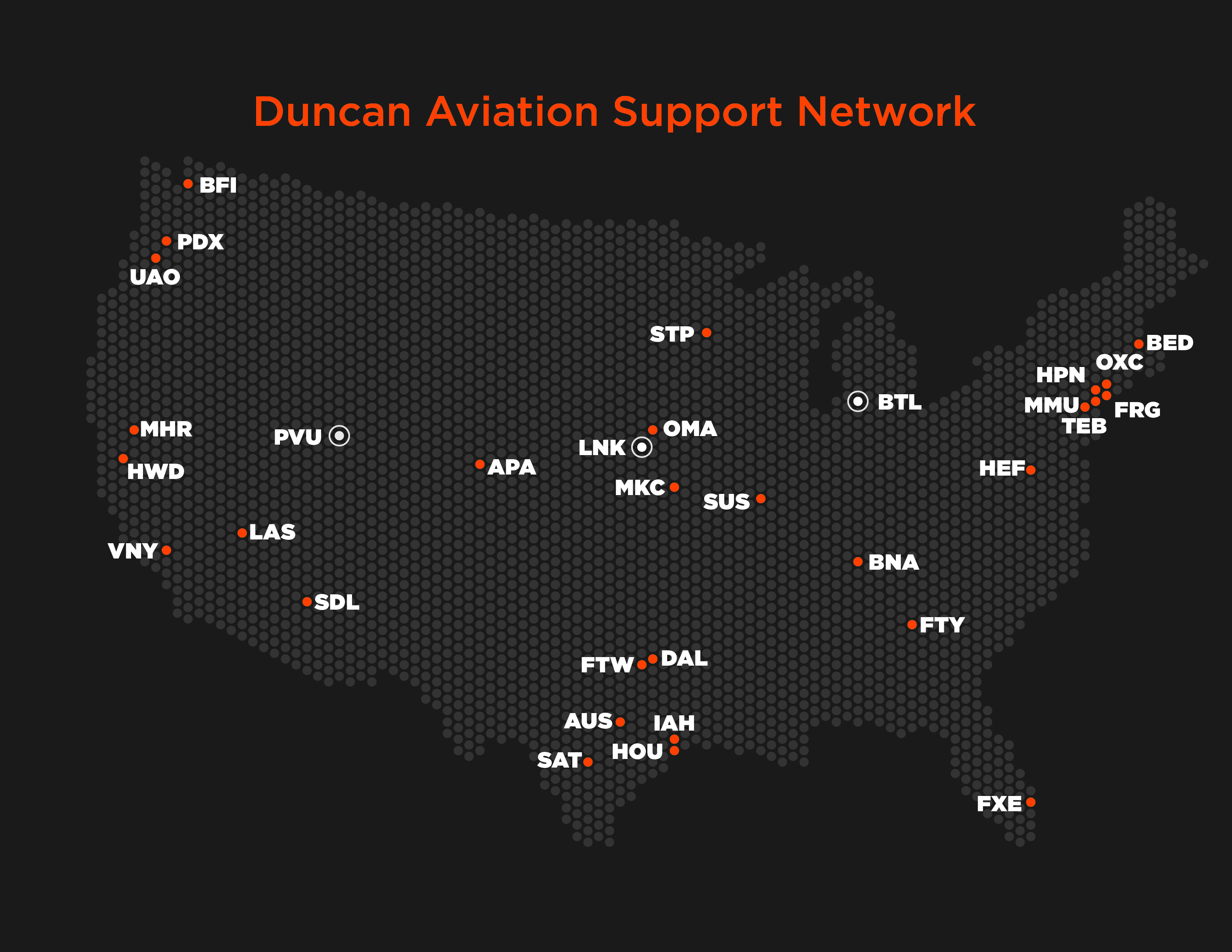 Duncan Aviation is an aircraft service provider supporting the aviation needs of business aircraft operators, government agencies, and other aircraft service providers. Services include major and minor airframe inspections, engine maintenance, major retrofits for cabin and cockpit avionics systems, full paint and interior services, engineering and certification services, fabrication and manufacturing services, and preowned aircraft sales and acquisitions. Duncan Aviation also has international aircraft components solutions experts available 24/7/365 at +1 402.475.4125 who can handle any aircraft system problem with immediate exchanges, rotables, loaners or avionics/instrument/accessory repairs and overhauls. Complete service facilities are located in Battle Creek, Michigan; Lincoln, Nebraska; and Provo, Utah. We also have dozens of other facilities strategically located throughout the United States to provide customers with scheduled regional support and the quickest response possible to avionics, engine and airframe Aircraft On Ground (AOG) situations.