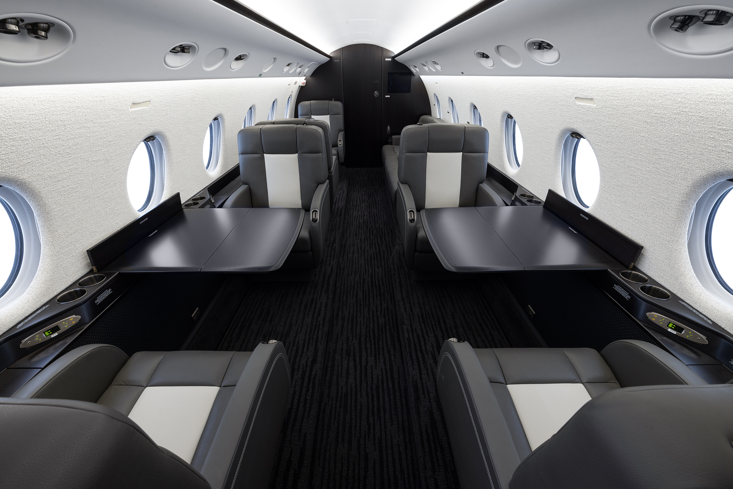 The new carpet is a two-tone blend of charcoal and black wool with a subtle linear pattern that complements the overall design without overwhelming it. The entryway features LVT flooring (luxury vinyl tile) that simulates stained concrete, offering a sleek, yet practical design that sets the tone as passengers step aboard. The powder-coated thresholds blend seamlessly with the dark flooring to allow for an unobstructed flow through the aircraft.