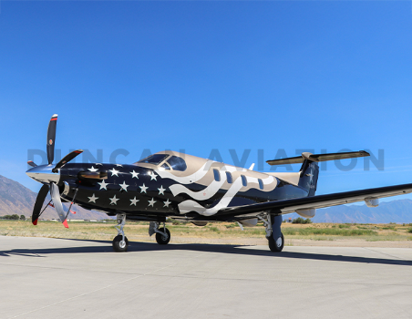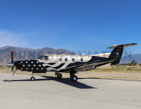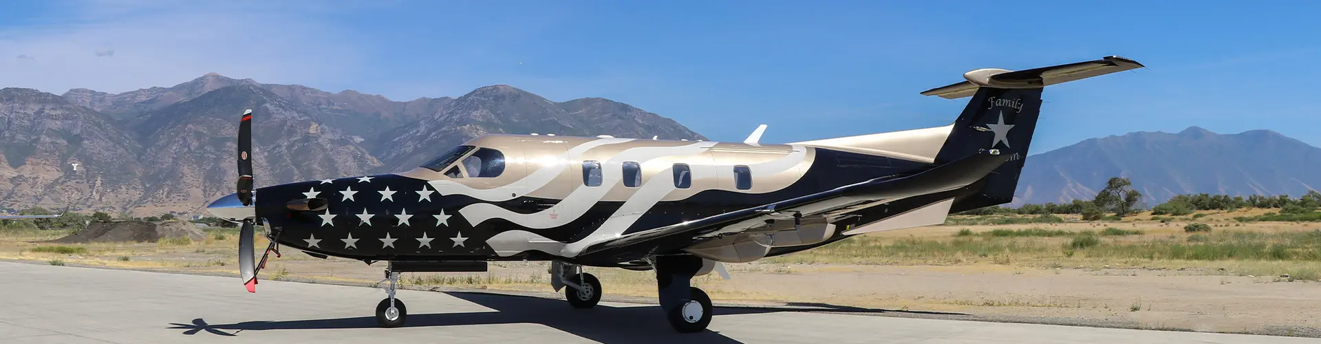 What began as an exploration into more modern, geometric paint schemes soon evolved into something deeply personal. The husband-and-wife owners initially leaned toward contemporary designs in black, taupe, and gold. However, inspired around the Fourth of July, they approached Duncan Aviation Senior Lead Designer Molly Pfeiffer with a bold new idea: a deconstructed American flag flowing seamlessly along the fuselage. The result is a PC-12 with an elegant, patriotic design. Subtle metallic taupe and gold complement deep black, while a hint of mint-blue around the stars and logo brings warmth and individuality. The tail features a large star surrounded by the words Family and Freedom, underscoring the personal meaning behind the project.